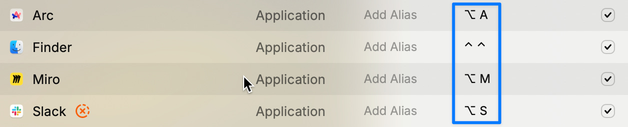 例えば、`Option + S`キーでSlackアプリを起動させることも可能です。