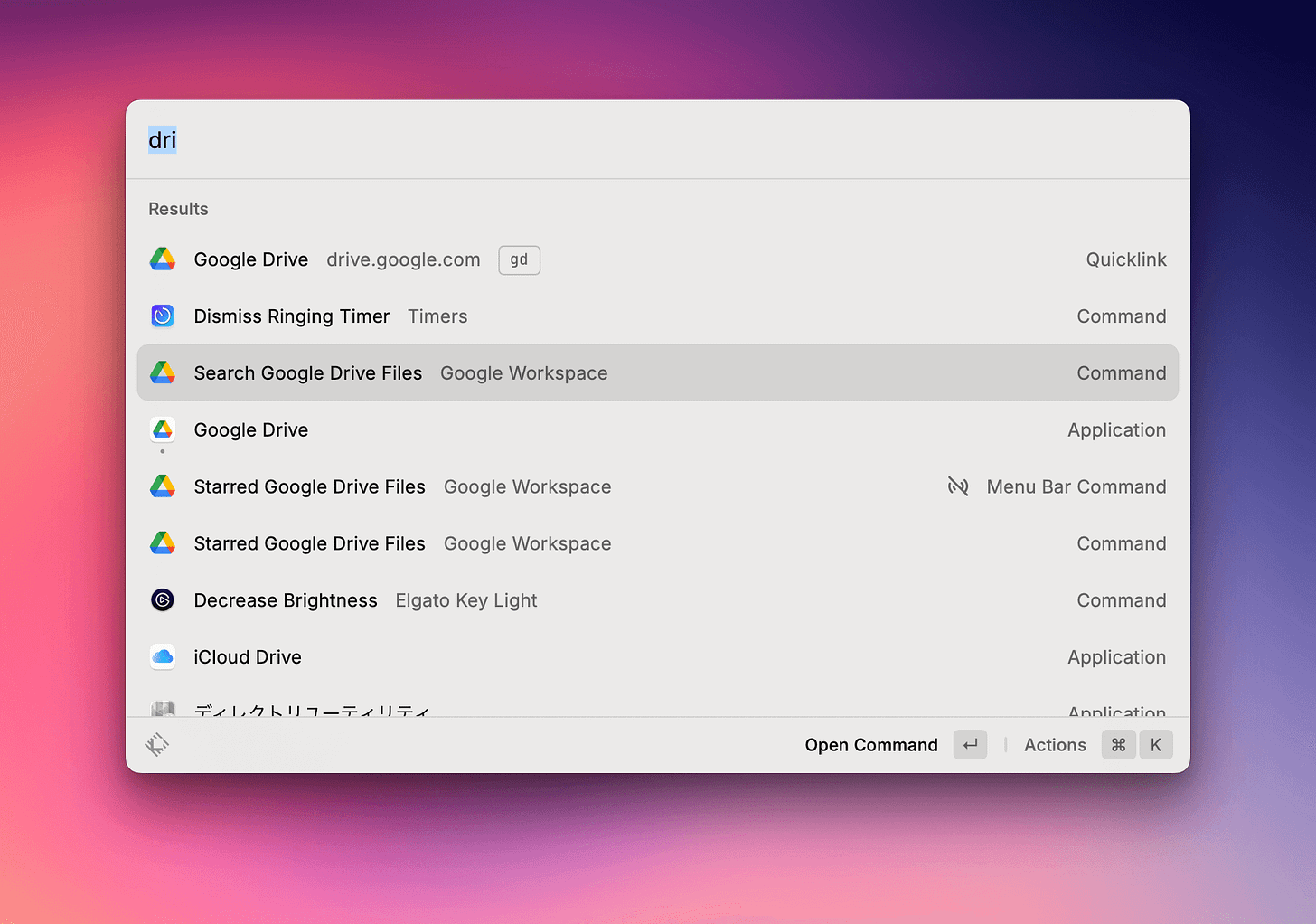 もし、Google Driveを調べたいときは、Raycastの拡張機能からGoogle Workspaceをいれると検索エリアが絞りやすくなります